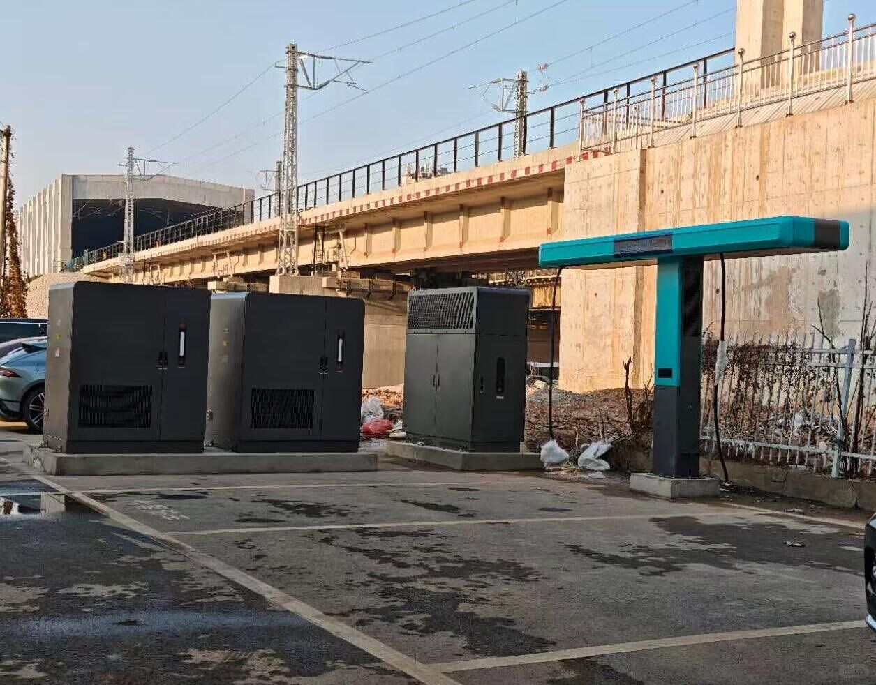 Looking at those three housings in the photos, it makes sense now. One housing should contain the 600 kW power modules. The other two? Battery energy storage systems (BESS).